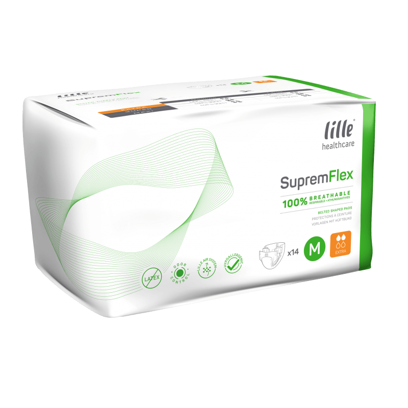 The Suprem Flex belted brief is designed for more active and independent males and females. This range can be used as an alternative to all-in-one briefs and large shaped continence aid where there is a specific need or clinical requirement. With a high level of absorption, the disposable brief provides the user with anti-leakage security and optimal comfort.